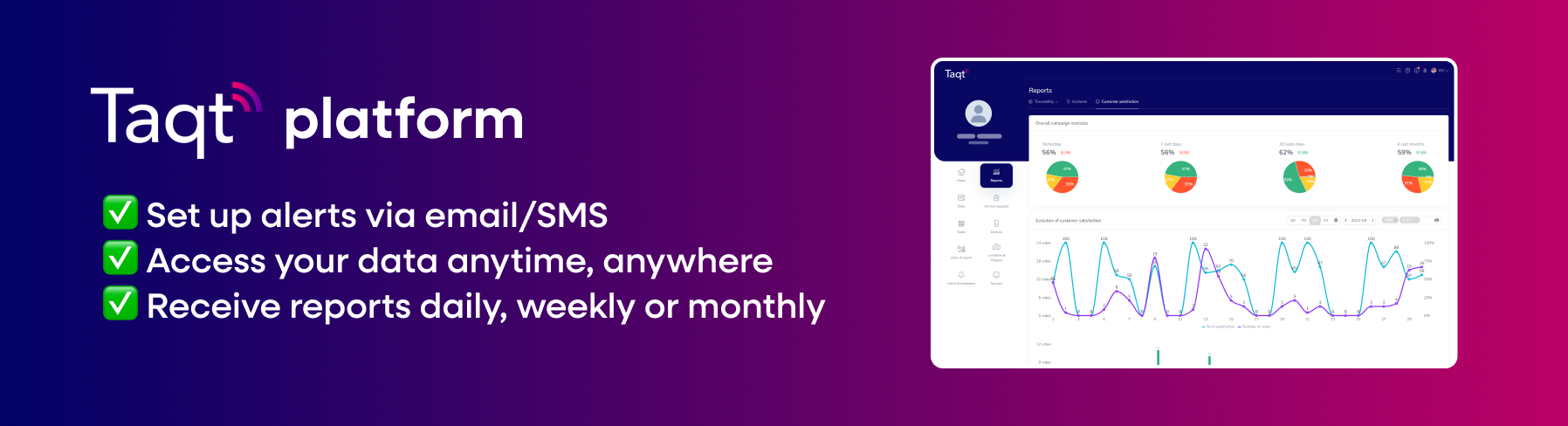 Together, the Taqt Platform and Smiley Device offer an integrated solution to monitor, analyze, and improve customer satisfaction while optimizing the management of your cleaning services.