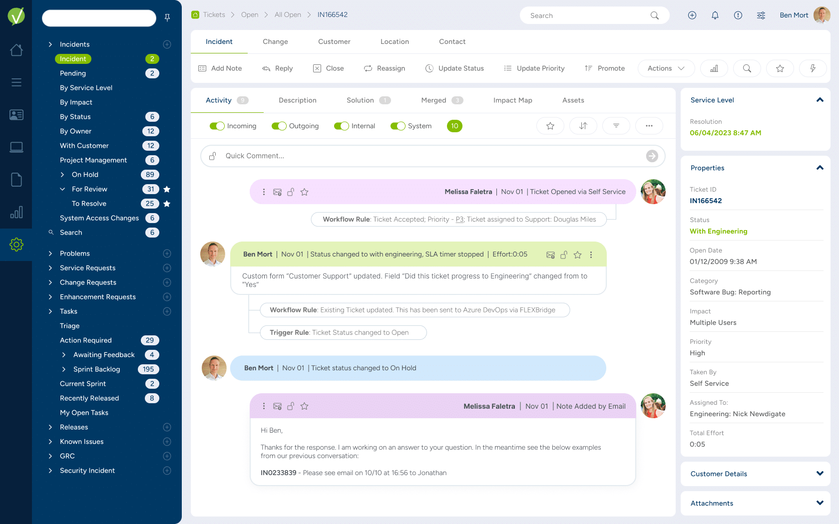 Vivantio - Queues: Manage Incidents, Problems, Service Requests, Change Management, and more in customised interfaces based on ticket type or team, ensuring the most important information is always at agents’ fingertips