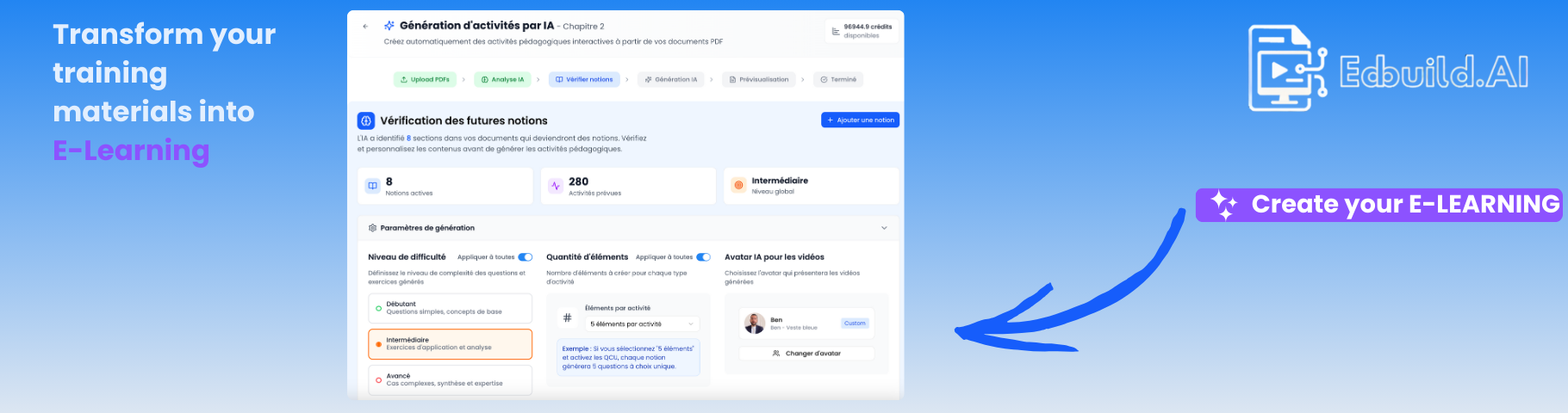 In just a few clicks, import a document: the AI identifies the key concepts in your document and then generates videos, multiple-choice questions, flashcards, glossaries, and many other e-learning activities. You can validate, edit, or regenerate each activity to maintain control over the teaching methods and brand tone. Everything is editable (including the avatar for the video, the script, and the presentation slides) for a result that reflects your image.