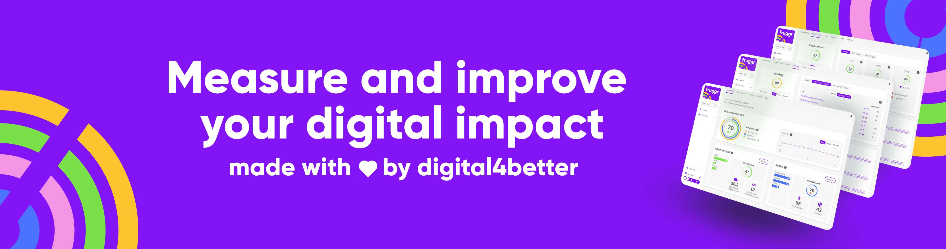 Our mission is clear: to support your company's sustainable digital approach with a powerful tool featuring accurate indicators. Fruggr enables you to take tangible action to reduce your environmental footprint, improve your social impact and make your digital services more accessible. Our goal: a digital environment that marries sobriety, high-performance and accessibility. digital world accessible to the greatest number.